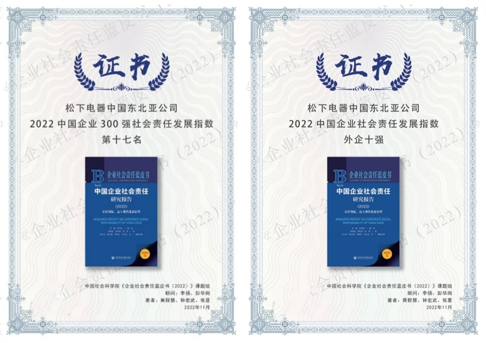 11 月 20 日,由中国社会科学院主办的第五届北京责任展暨《企业社会责任蓝皮书(2022)》发布会在京举办。会上,发布了 2022 年度中国企业 300 强(国企 100 家、民企 100 家、外企 100 家)社会责任发展指数排名。松下电器(中国)有限公司(以下简称:松下)取得了榜单第 17 位,外企第 3 位,日资企业第 1 位的优异评价。