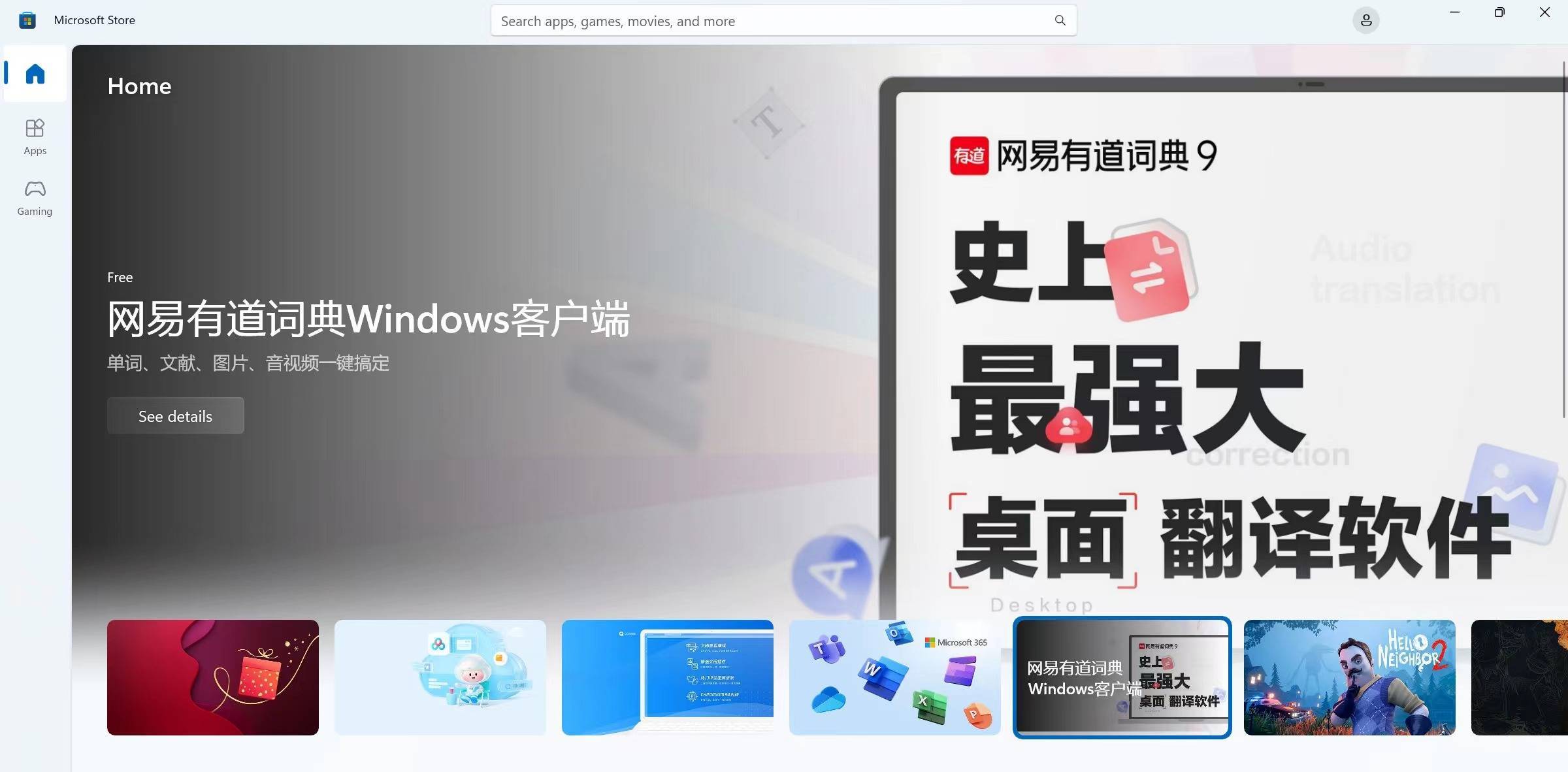 北京时间 11 月 23 日,网易有道词典正式上架微软应用商店并在主屏推荐。凭借微软数字分发平台的巨大流量,这款史上最强大的桌面翻译产品将帮助更多微软和有道词典的用户提升工作效率与生产力,满足世界各地学习者在多场景下的个性化学习需求。