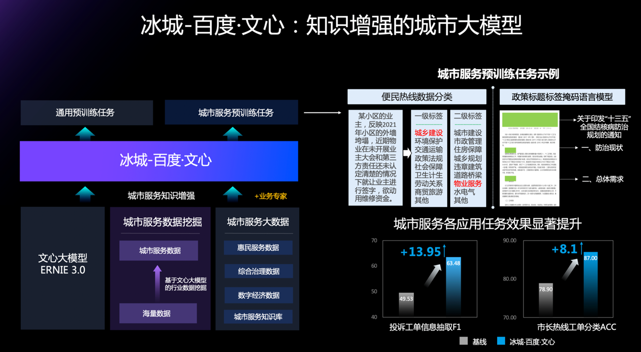 据介绍,冰城-百度·文心大模型将城市中跨业务、跨结构、跨部门的数据知识和多种任务算法进行融合,基于百度文心 NLP 大模型 ERNIE 3.0,打造统一预训练模型,提供超强的语言理解、语义分析等能力,支撑城市各领域 AI 规模化应用的开发效率和效果的提升。