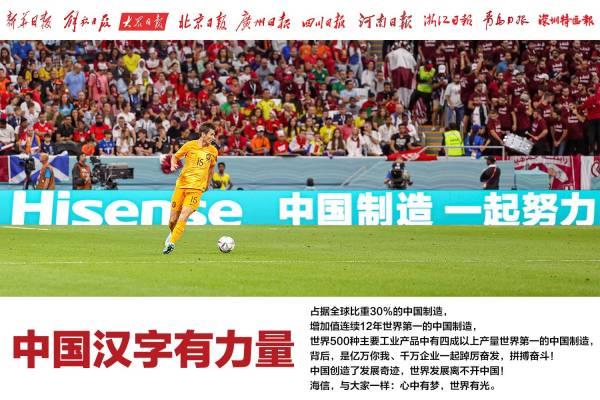 据了解, 卡塔尔世界杯开幕后, 赞助商海信打出的「中国第一 世界第二」球场广告引发了全球观众热议。随后, 自 11 月 29 日起, 海信将「中国第一 世界第二」改成「中国制造 一起努力」, 表达自己为中国制造加油喝彩, 为中国制造在世界顶级赛事舞台呐喊助威的初心。作为中国制造的代表, 海信此番提升中国制造全球形象的公益行动, 让更多人注意到团结低调的中国制造产业。正如 10 家党报在公益广告中所言:中国制造占据全球比重 30%, 增加值连续 12 年世界第一, 在世界 500 种主要工业产品中有四成以上产量世界第一。