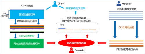 针对五个预测任务, 腾讯 Angel PowerFL 联队在 iDASH 公开的数据集上分别训练了三个线性回归模型和两个逻辑回归模型, 获得了接近满分的模型效果指标。在进行安全模型推理时, 利用 CKKS 同态加密算法加密五个线性模型的参数和待测试数据矩阵, 在密文下完成模型推理, 并通过优化密文矩阵和密文向量乘法获得了单线程下最优的模型推理速度。