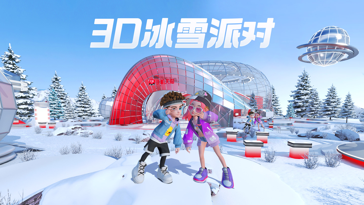 最近,手机天猫用 3D 技术办了一场「元宇宙」冰雪派对,消费者通过天猫 App 的首页入口,就可化身虚拟人物进入手机天猫打造的冰雪世界。