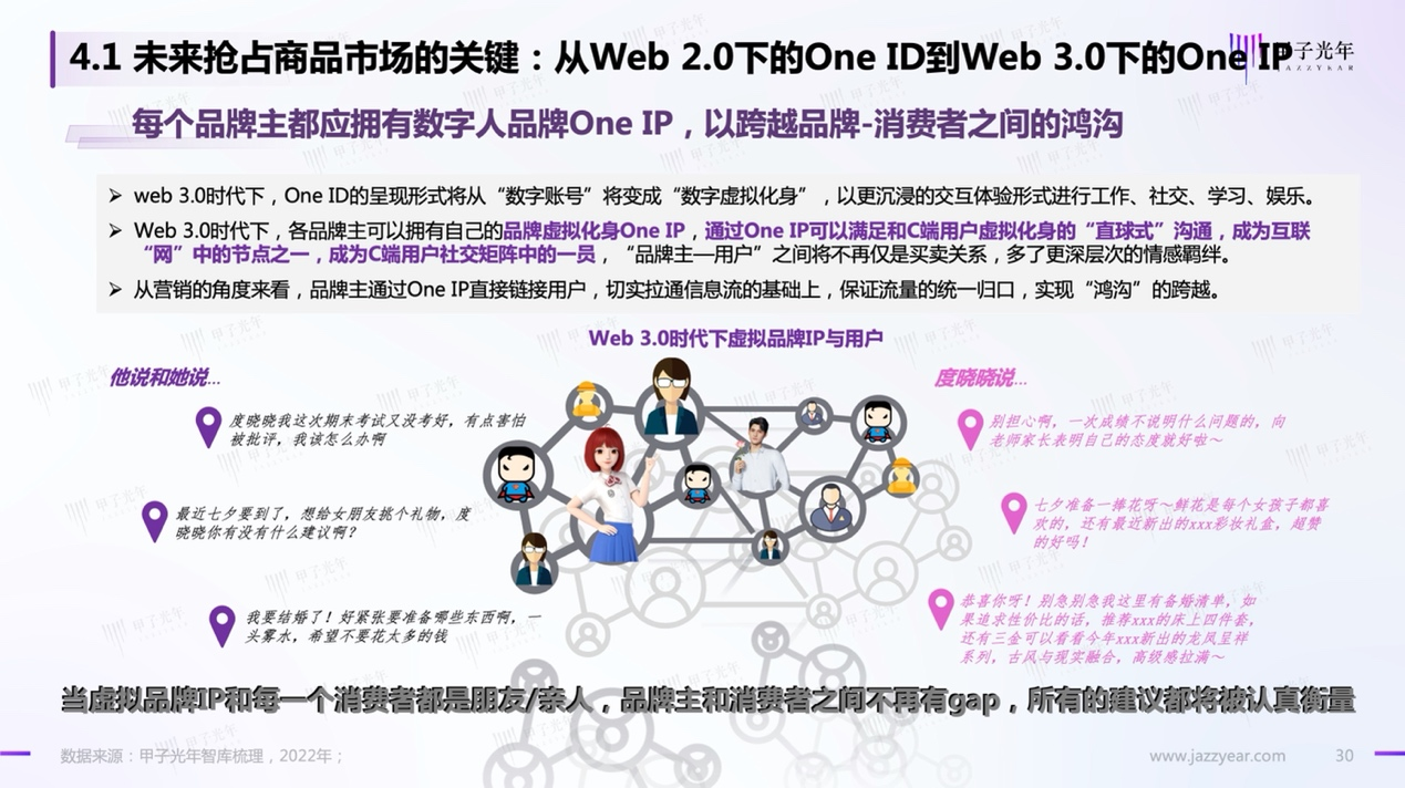 白皮书指出,数字人营销将成为未来抢占商品市场的关键,每个品牌主都应拥有数字人品牌 One IP,满足和 C 端用户虚拟化身的「直球式」沟通,成为互联「网」中的节点之一,也成为 C 端用户社交矩阵中的一员,以跨越品牌与消费者之间的鸿沟。