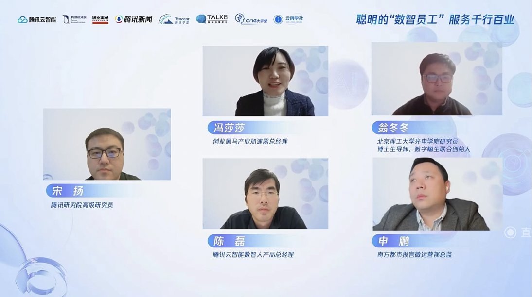 12 月 20 日,由腾讯云智能、腾讯研究院、创业黑马联合主办的「数字人产业发展趋势解读」在线上举行。腾讯云智能数智人产品总经理陈磊、创业黑马产业加速器总经理冯莎莎,北京理工大学光电学院研究员、博士生导师、数字栩生创始人兼 CTO 翁冬冬,南方都市报官微运营部总监申鹏,与线上观众共同解析、探讨数字人产业发展趋势。