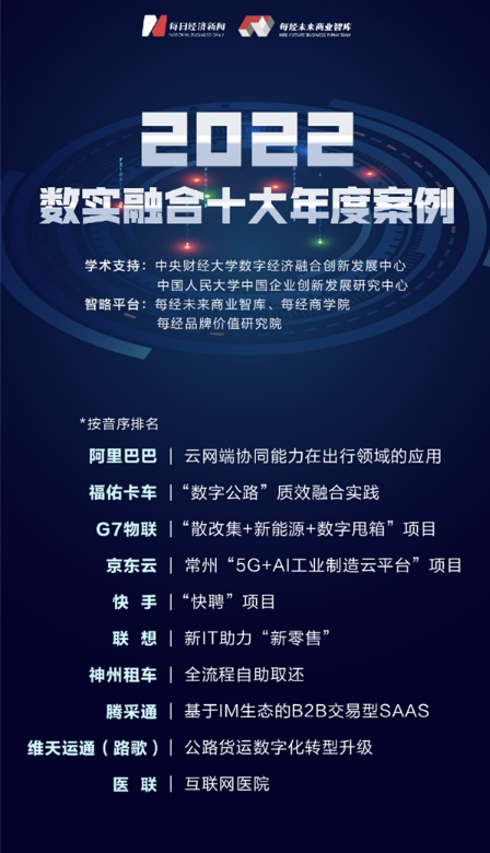 12 月 22 日,由每日经济新闻特别策划「2022 数实融合十大年度案例」评选结果出炉,经每经智库筛查、专家评审和公示程序,福佑卡车旗下的「『数字公路』 质效融合实践」项目凭借在赋能公路运输降本增效方面的突出表现成功入选。
