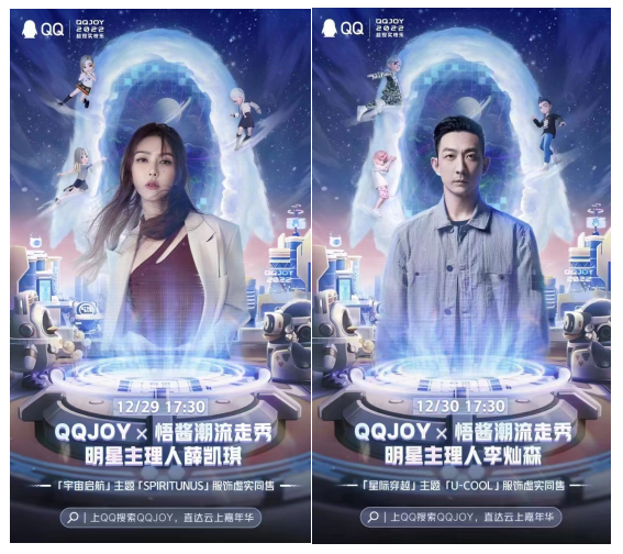 第四、第五场,12 月 29、30 日下午 5 点半,QQJOY 潮流走秀。明星队长薛凯琪、李灿森将分别领衔每日一场的潮流走秀,分别组成宇宙启航队、星际穿越队,展示 128 件顶级潮流艺术家和国际时尚设计师的新作,同时为大家送上同款实物大奖。