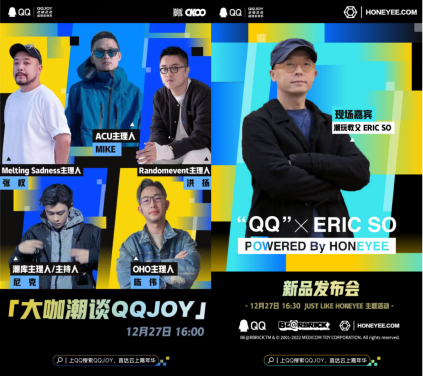 第一场,12 月 27 日下午 4 点,QQJOY 潮流首发日。潮流主教洪扬、张权、MIKE 携手潮库,将开启一场跨次元连麦,分享超现实世界潮流动态和趋势。同时,国际潮流机构 HONEYEE 也派出了 ERIC SO,将会现场首发 QQ x BE@RBRICK 第三款潮玩首秀。现场粉丝还有机会获取幸运大奖。