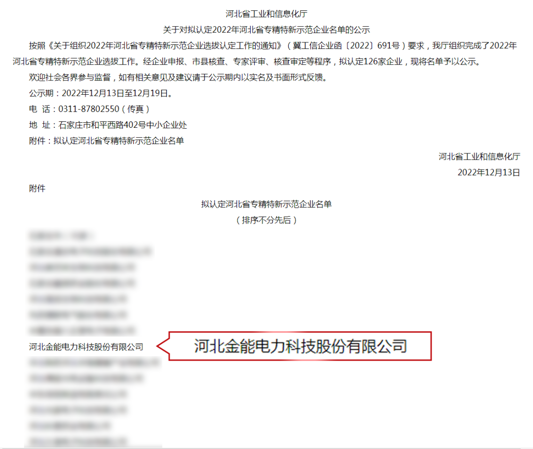 12 月 22 日,河北省工业和信息化厅公布 2022 年河北省专精特新示范企业,此次共有 126 家企业和 61 家第四批专精特新「小巨人」企业入选 2022 年河北省专精特新示范企业,河北金能电力科技股份有限公司在众多企业中脱颖而出,被认定为河北省专精特新示范企业。据悉,此次是金能电力第二次荣获河北省「专精特新」示范企业称号。