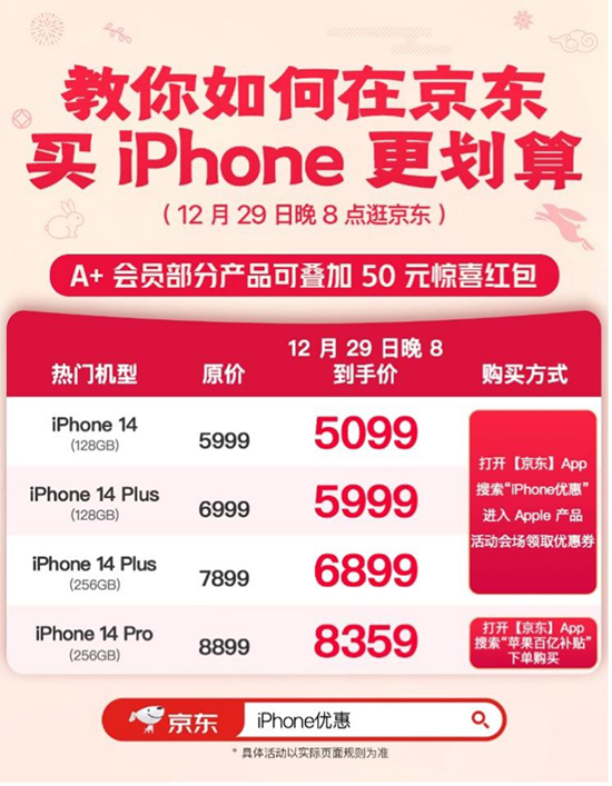 首先是价格方面,京东 Apple 年货节期间 iPhone 14 领券至高减 900 元,到手价 5099 元起;iPhone 14 Plus 限量优惠 1000 元,到手 5999 元起;iPhone 13 领券立减 400 元,到手价低至 4699 元。iPhone 14 Pro 系列京东现货开售,下单就发货,元旦不打烊。值得一提的是,开通 Apple 产品京东自营旗舰店 A+会员,部分产品还可叠加 50 元惊喜红包,以 iPhone 14 为例,京东年货节领券立减 900 元,开通京东 A+会员可减 950 元,到手更划算。温馨提示:京东 Apple 年货节 12 月 29 日晚 8 点全面开启,12 月 31 日前都可享受超值低价。