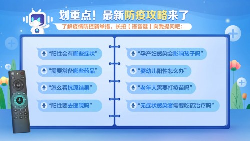 科大讯飞基于运营商庞大的用户基础,发挥自身语音识别、语义理解等技术优势,在语音遥控器的硬件基础之上,结合时下热点,上线大屏防疫专题服务,把老百姓所需的各类防疫知识「搬」到电视屏幕上。老百姓通过家中的语音遥控器对着电视提问,便可快速获取日常的防疫知识要点。在疫情防控的关口下,开辟一条全新的防疫路径,为各地居民提供更贴心、更人性化的便捷服务。
