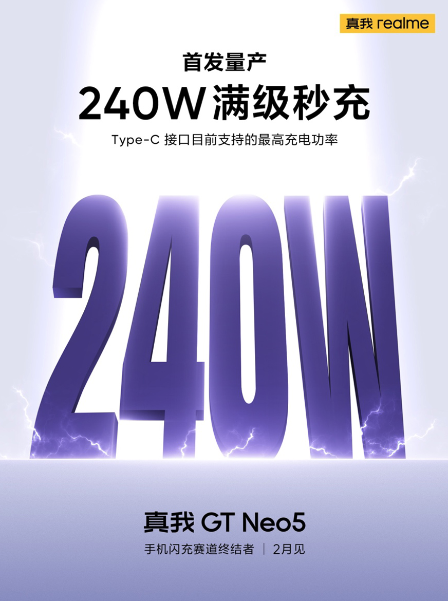 当然,真我不会让用户花太久时间去等待这项闪充黑科技,沟通会上真我正式宣布,全新的真我 GT Neo5 将于今年 2 月发布,全球首发量产 240W 满级秒充,届时将带来更多越级惊喜,敬请期待。