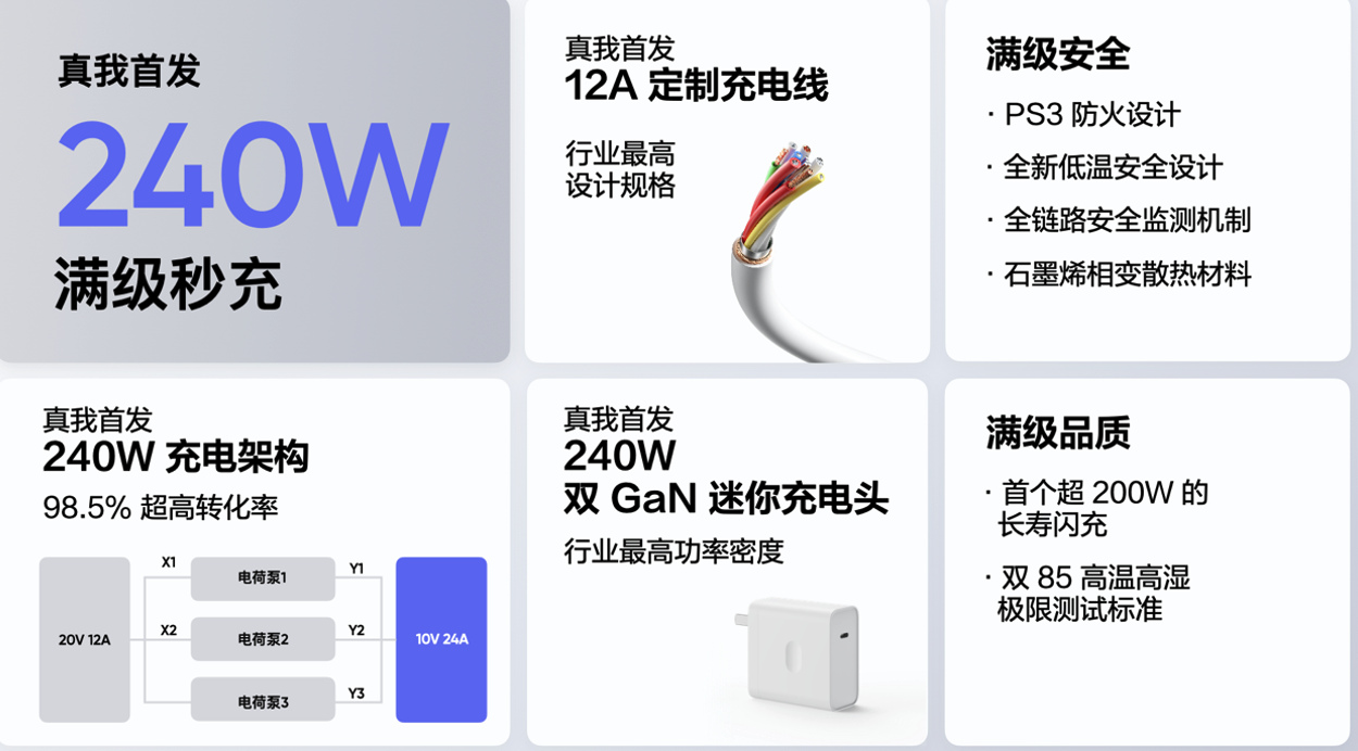 为实现 240W 满级功率,真我带来三项行业首发的闪充技术。
