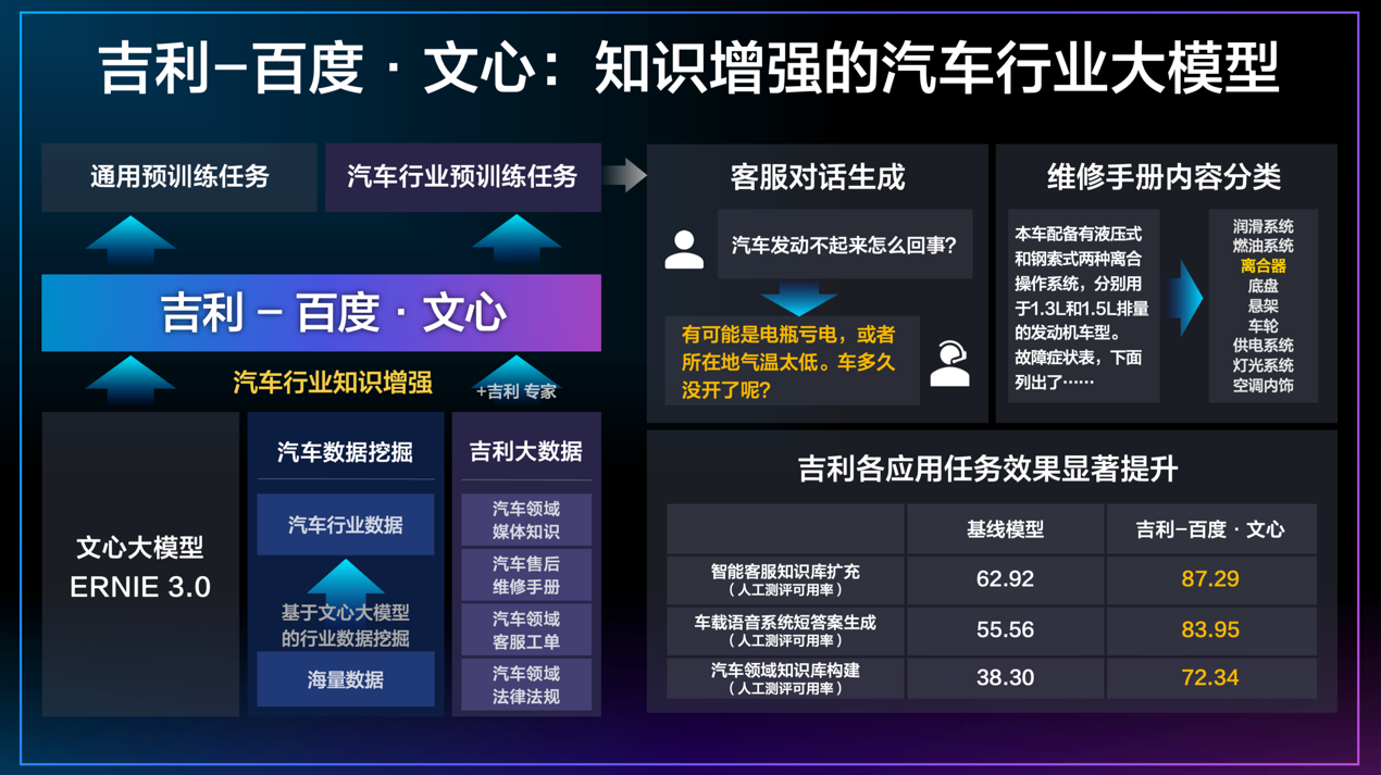 吉利与百度共建的吉利-百度·文心汽车行业大模型使用了百度文心 ERNIE 3.0 大模型,在智能客服知识库扩充、车载语音系统短答案生成、汽车领域知识库构建三个任务上进行了微调与验证。该大模型在 2300 万条吉利汽车专业领域无标注数据上进行模型预训练,并联合双方的人工智能专家和汽车行业专家一起研发,充分理解掌握了汽车行业知识,从而得到性能更强、稳定性更高的汽车行业大模型。