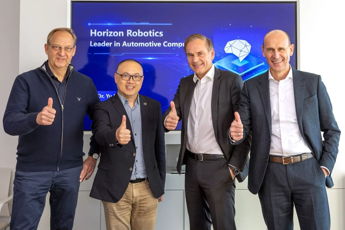 大众汽车集团兼首席执行官 Oliver Blume、大众汽车集团(中国)董事长兼首席执行官贝瑞德、CARIAD 首席执行官 Dirk Hilgenberg 与地平线创始人余凯在德国合照