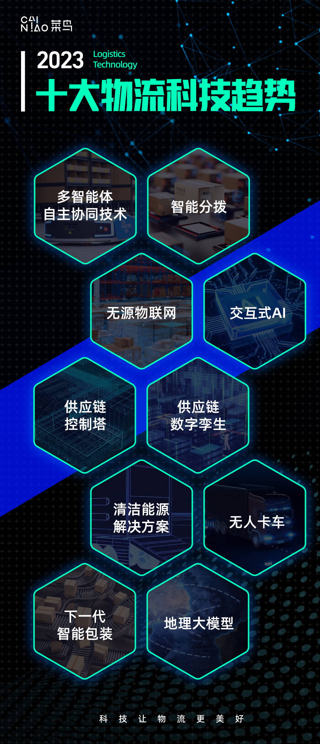 1 月 11 日,菜鸟对外发布了 2023 物流科技的十大趋势。多智能体自主协同技术、智能分拨、无源物联网、下一代智能包装、供应链数字孪生、数字供应链控制塔、交互式 AI、无人卡车、地理大模型、清洁能源解决方案,被认为将引领新一年的物流科技趋势。