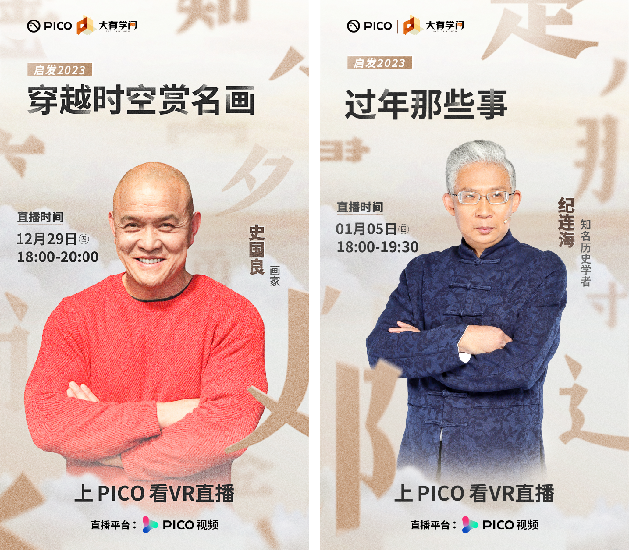 春节将至, 各种新春民俗和传统文化活动成为舆论关注的焦点。近日,XR 品牌 PICO 邀请到两位国内知名文化大咖在 PICO 视频和抖音双平台进行了两场 VR 直播。12 月 29 日, 知名画家史国良做客 PICO 视频直播间, 以 VR 直播的形式与用户赏画聊艺术, 向用户展示中国传统绘画的深刻美学价值。1 月 5 日, 知名历史学者纪连海同样通过 VR 直播的方式, 结合春节的历史发展和过年习俗演变, 给大家上了一堂生动的「新春民俗课」。