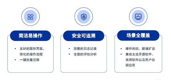 统信迁移软件有易通过全面的环境检测、智能的兼容性评估、简洁的流程操作,既能保障原有硬件和应用环境不变的情况下完成平滑迁移,也能针对新增扩容的场景提供兼容性评估,辅助用户进行系统迁移。