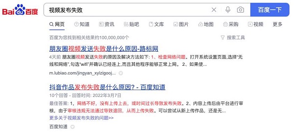 在百度搜索「视频发布失败」,跳出的相关结果有超过 1 亿条。