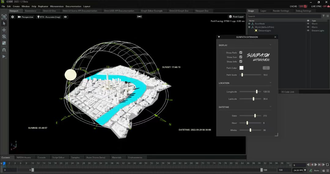 在开发 SunPath 这款插件时,他在技术上主要参考了官方给出的案例、外部 Python 包的运用、合理文件结构和 UI Scene Api 的运用。他解释道,算法和 UI 都基于 Python 开发,从一开始梳理出技术路径到实际着手开发,技术还是很容易跑通的。此外,他惊叹于 Omniverse 渲染技术,称 Omniverse「使测试场景非常逼真,所见即所得!」