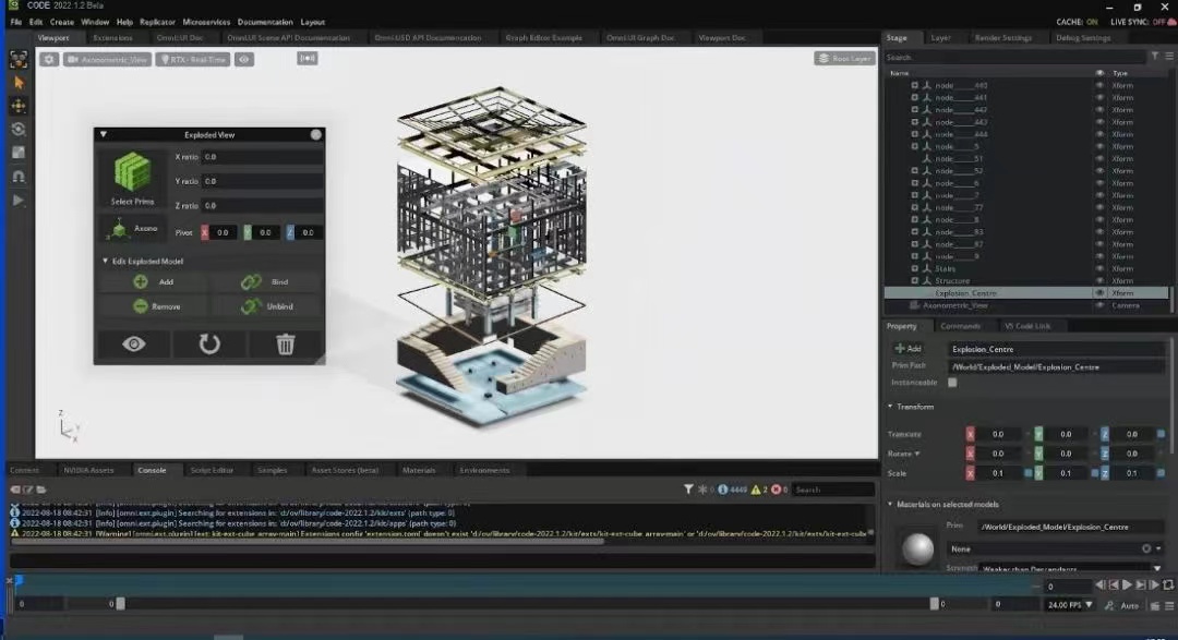 此次他在 Omniverse 上开发的一键生成爆炸图插件 Exploded View 主要关注的是对 USD 本身几何属性的调用和操控。插件巧妙的利用了 Omniverse 对组件进行 Group 后能自动计算其共同几何中心的特性,再分别读取每个组件自身的几何中心,进行爆炸距离的计算。