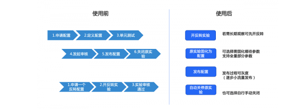 常规的 A/B 测试平台,在设计配置 A/B 实验时,均需要产品、研发、运维通力合作才能实现,时间成本和人力成本较高,同时上线功能出现问题后回滚处理的时间也较长。这种高成本和风险的不确定性,让很多企业对于 A/B 实验在自己业务中的广泛应用望而却步。