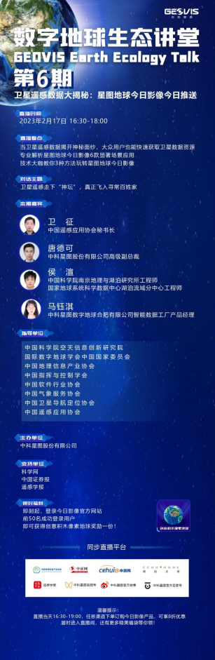 星图地球今日影像是什么?除了能为用户发送私人定制的地球影像外,还有哪些优势功能?2 月 17 日,中科星图股份有限公司(以下简称「中科星图」)举办第 6 期数字地球生态讲堂,中国遥感应用协会秘书长卫征,中科星图高级副总裁唐德可,中国科学院南京地理与湖泊研究所工程师、国家地球系统科学数据中心湖泊流域分中心工程师侯渲,中科星图数字地球合肥有限公司智能数据工厂产品经理马钰淇带你走进直播间,「零距离」感受卫星遥感数据服务,教你玩转星图地球今日影像。