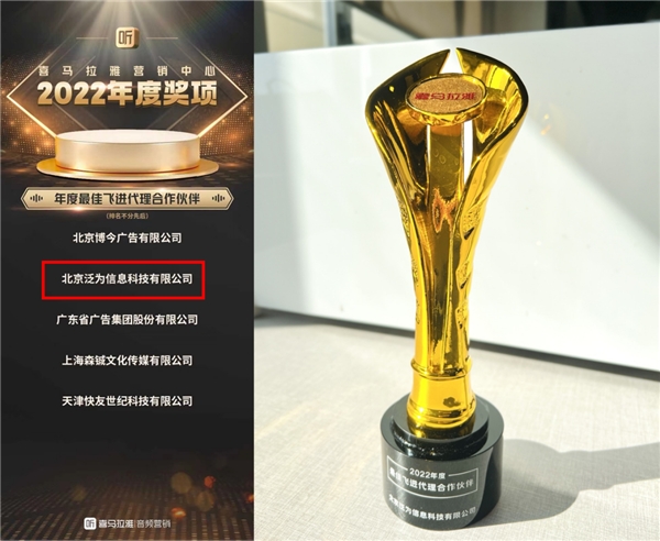 春日律动, 捷报传来! 由国内最大的在线音频平台喜马拉雅评选的年度奖项榜单出炉。其中泛为科技凭借强劲的发展势头和出色的合作表现, 荣获喜马拉雅营销中心颁发的 2022「年度最佳飞进代理合作伙伴」奖。