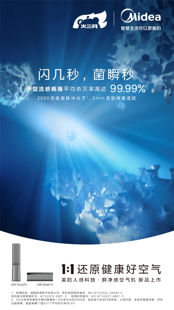 美的鲜净感空气机采用了高能脉冲杀菌技术, 可以有效地破坏甲流病毒的蛋白质、DNA, 使其失去复制能力, 从而实现高效的杀菌效果, 预防和控制各种传染病的传播。经权威实验验证, 美的鲜净感空气机搭载的高能脉冲杀菌技术, 可在 2 分钟内达到 99.9% 的除菌率, 对空调内部进行有效消杀, 让空调开启前更洁净健康。
