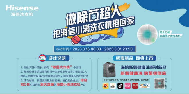 据了解,此次小游戏超级奖品,海信小满洗衣机,即是海信洗衣机将于 3 月 23 日发布的新氧健康洗新品。它搭载了行业先进的除菌科技,能够高效清除衣物上的细菌、真菌、病毒、螨虫等微生物,实现广谱消杀,还不伤面料,帮助用户解决日常洗护除菌不彻底的痛点。可以说,海信新氧健康洗新品,不仅在用户层面,为现代家庭提供了一种衣物除菌与养护的完美解决方案,更在行业层面,将健康洗标准升级到新的高度。