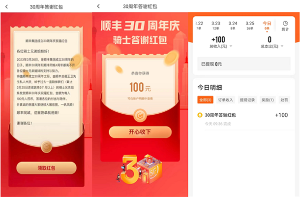 平台发放给骑士的红包寄语里提到,本次是由顺丰总裁王卫先生私人出资,凡符合近 1 年内连续跑单且截止 23 年 3 月 25 日连续跑单 3 个月以上要求的骑士,都能获得此次王卫赠予的周年庆骑士的 100 元答谢红包。以此答谢骑士们的付出与陪伴。
