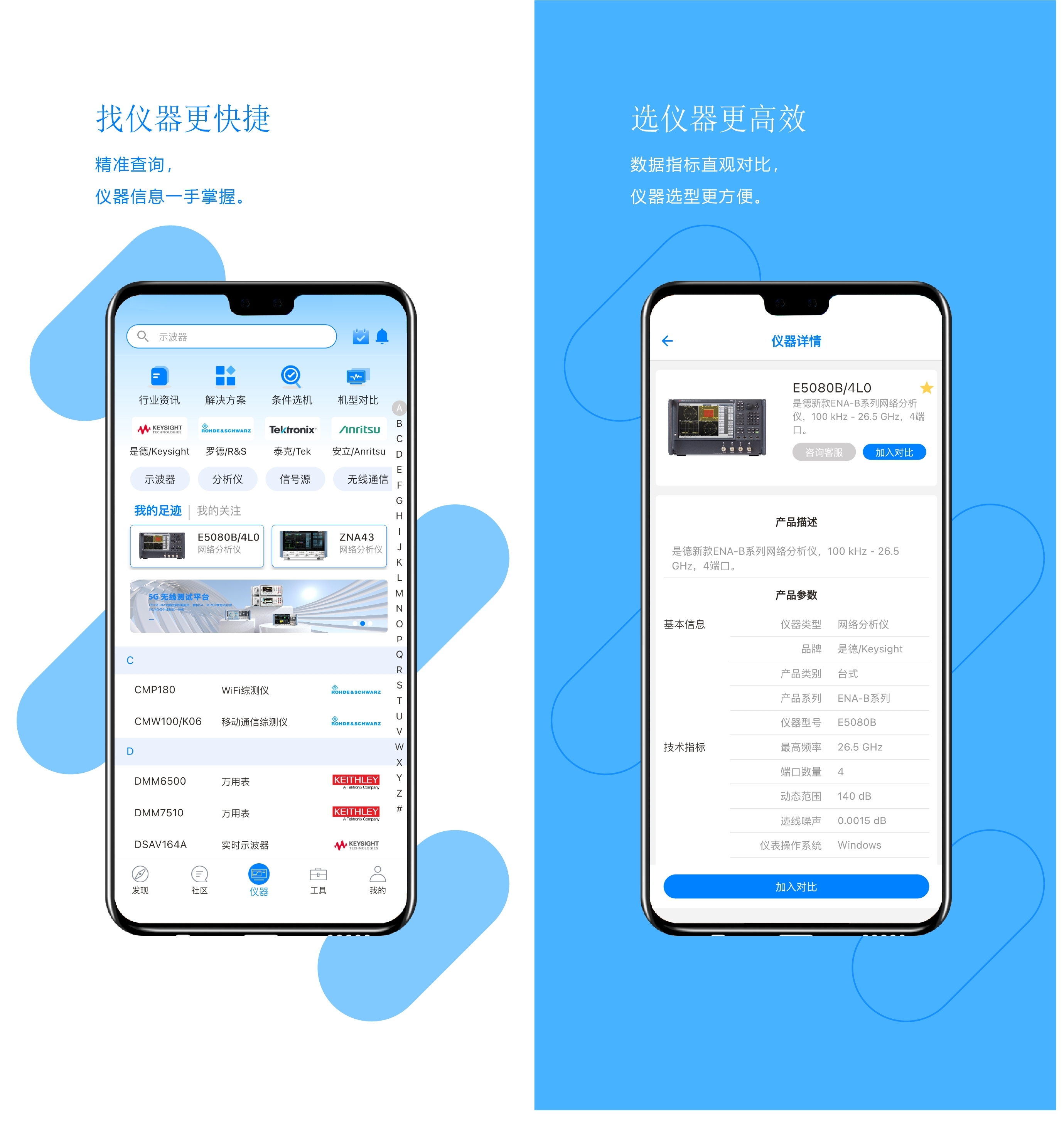 基于行业内普遍出现的测试仪器选型定型难的问题,君鉴科技结合自身长期深耕测试测量行业的经验优势,推出了服务电子测试行业的垂直APP“每日E问”,助力电子测试行业工程师、采购人员、专业学习者在平台获取一站式测试测量仪器信息与服务。每日E问APP海量收纳电子测试行业全品类机型,如示波器、分析仪、信号源等多种测试测量仪器型号资料,将多家厂商仪器信息聚集于平台中,为电子测试工程师提供“条件选机”、“仪器对比”、“实验室预约”等功能。工程师可在平台内根据测试需求,通过型号搜索、参数限定、应用场景、仪器类型等多种条件筛选所需的测试仪器型号,并对多个仪器型号进行同屏一键对比,还可以查看下载仪器配置指南等原厂资料,简化仪器筛选过程,提升方案搭建效率。