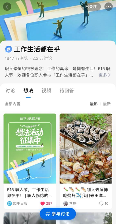 职场之外,职人的生活更加丰富。职人节期间,围绕穿搭、通勤、美食、办公神器、睡眠等关键词,知乎发起「工作生活都在乎」想法活动,只要参与发布相关主题就有机会获得职人惊喜奖品。与此同时,职人节期间知乎还准备了多场圆桌直播,为职人在就业、财富和健康方面的需求来带专业讨论。