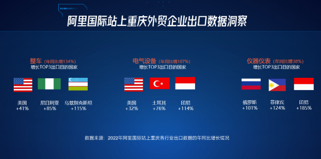 近年来,重庆跨境电商实现了跨越式发展,2022 年,重庆实现跨境电商交易额 407.1 亿元,同比增长 27.9%。同期,阿里巴巴国际站上重庆区域的商家跨境电商出口增长迅猛。阿里国际站的数据显示,2022 年,重庆的整车行业出口前三目的国家分别为美国、尼日利亚和乌兹别克斯坦,其中到乌兹别克斯坦的出口额同比增长高达 118%;电器设备行业出口前三目的国家分别为美国、土耳其和印尼,其中到印尼的出口额同比增长高达 114%;仪器仪表行业出口前三目的国家分别为俄罗斯、菲律宾和印尼,并且都获得了翻倍增长,重庆仪器仪表行业对这三个国家的出口额同比增长分别为 101%、124% 和 185%。