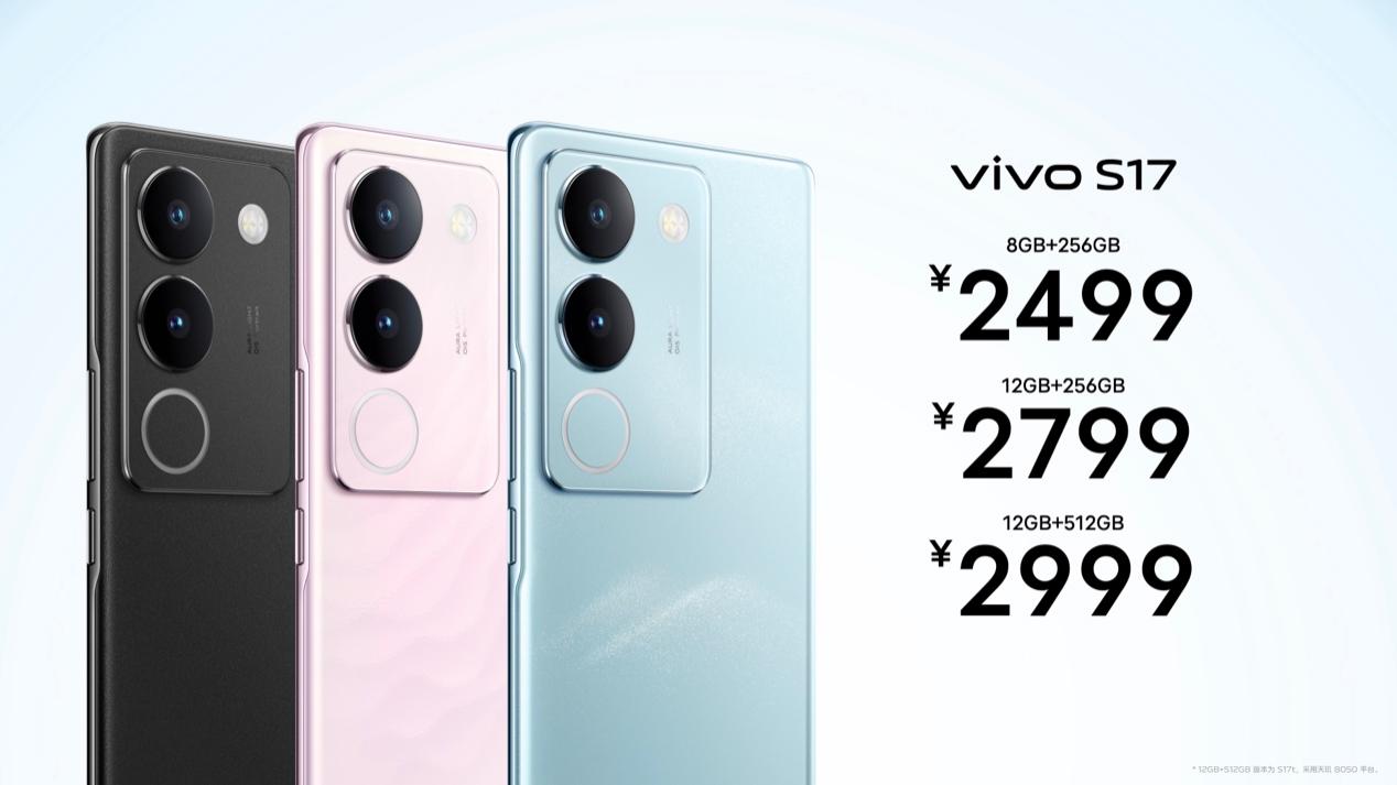 vivo S17 Pro 有山海青、冰白玉、玄黑三种配色,8GB+256GB,3099 元;12GB+256GB,3299 元;12GB+512GB 版本,3499 元。vivo S17 有山海青、花海、玄黑三种配色,其中 vivo S17 8GB+256GB,2499 元;12GB+256GB,2799 元; 12GB+512GB 版本 (vivo S17t),2999 元。