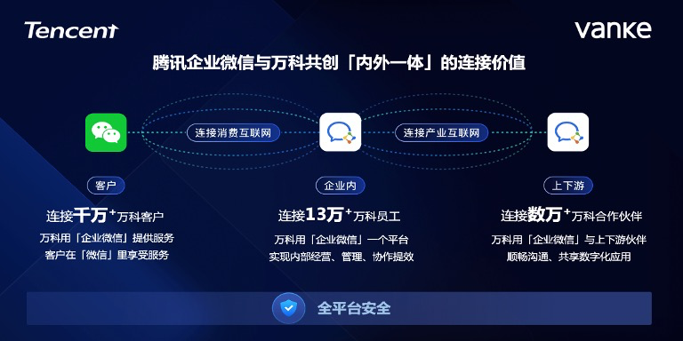 其中作为这次战略合作首个落地项目,企业微信将成为万科的移动数字化「底座」,对内横向连通房地产开发、物业服务、长租公寓等 8 大业务,连接员工及上下游产业伙伴,对外为过千万客户提供更多场景、高质量的服务体验。万科将以企业微信为切入口,在多业务场景中构建自身领先的技术实力,与腾讯一起探索新技术在各业务场景中的落地与应用。