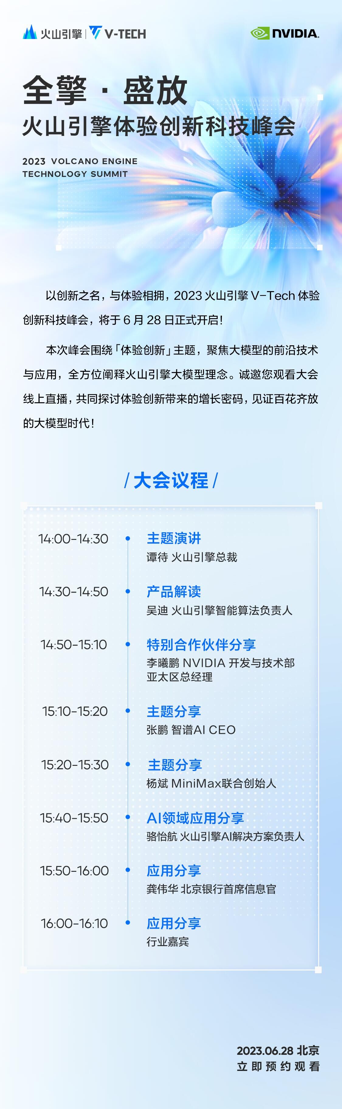 6 月 28 日,2023 火山引擎 V-Tech 体验创新科技峰会即将开启!本次峰会将围绕「体验创新」,聚焦大模型热点,携手模型企业及应用企业,共议未来「多云多模型」时代下的大模型生态建设。