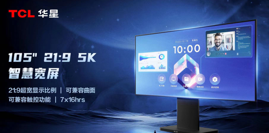 此次展览会上,TCL 华星多款商显展品大放光彩。采用 TCL 华星 HVA 技术打造的 105" 21:9 5K 智慧宽屏吸引着无数全球观众的目光,超高对比度、超宽显示比例、超细腻真实画质等显示性能,以及 7 x 16hrs 长时间使用、兼容曲面及触控功能等特性,为会议、教育场景客户带来更多产品形态选择和更加真实、清晰的视觉体验。