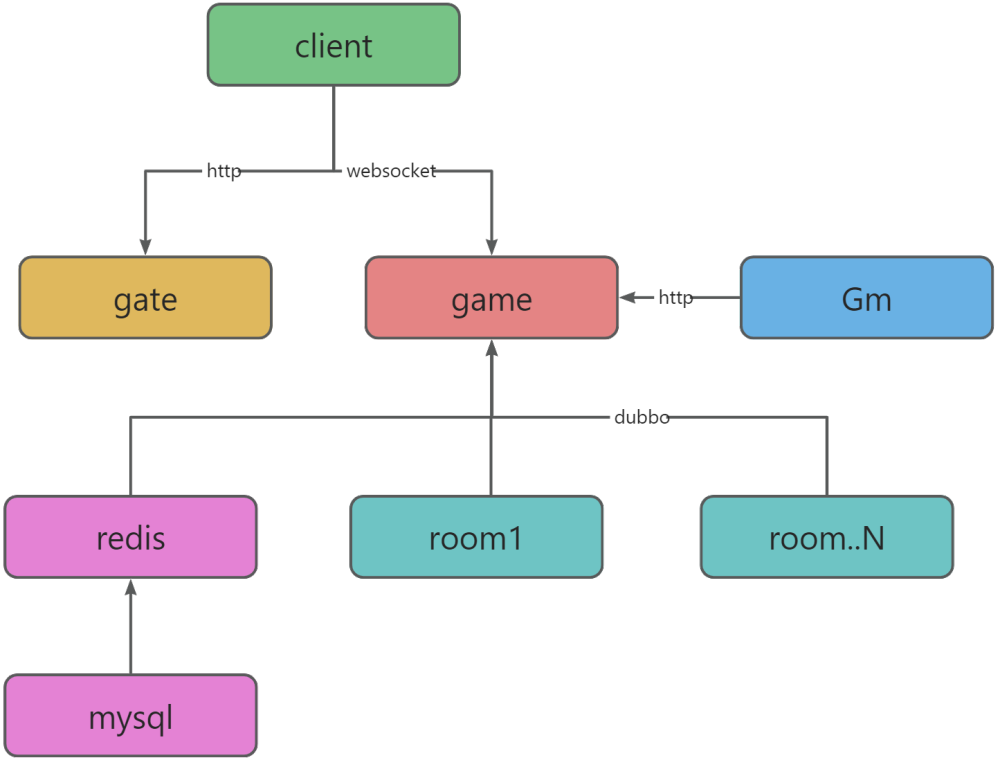 room:房间服,玩家匹配进入战斗后将进入战斗服,如果战斗多可以做动态扩展。