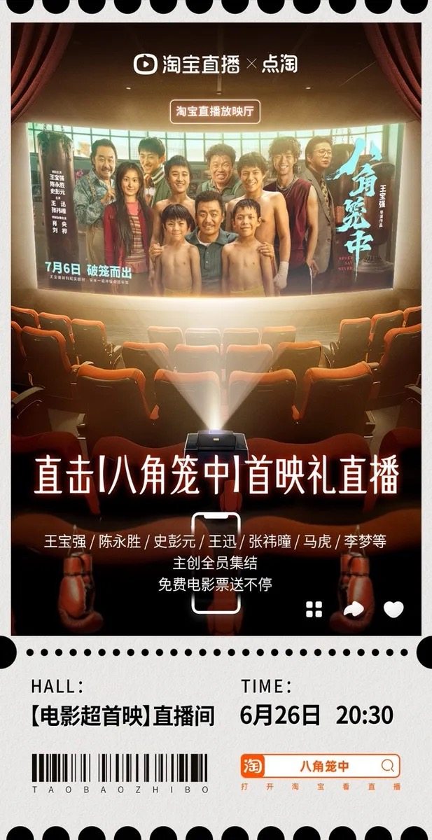 继 TVB 港剧式直播、梅西粉丝见面会、东方卫视海派直播、奇葩说辩手开杠式直播后,淘宝又把电影首映礼搬进了直播间。6 月 26 日晚 8 点,王宝强将携新片《八角笼中》上线淘宝直播间,影迷可以在线围观主创开麦。