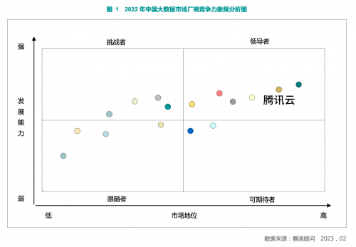 刚刚获悉,第三方调研机构赛迪顾问(CCID)正式发布《2022-2023 年中国大数据市场研究年度报告》(下称「《报告》」),《报告》对中国大数据市场的发展现状、市场规模、行业应用和产品结构、市场竞争情况及未来发展趋势等进行了全面解析。腾讯云大数据凭借领先的技术优势以及广泛的行业应用,稳居领导者行列。