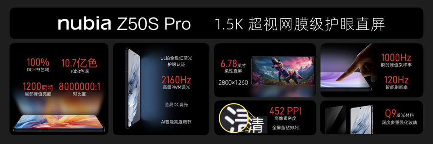 在具备出色显示效果的同时,努比亚 Z50S Pro 屏幕还实现了功耗的平衡,搭载 Q9 发光材料,相比上一代发光材料功耗降低 15%。屏幕钢化玻璃采用深度多重强化工艺,硬核防摔。为保护用眼健康,新机屏幕还支持 2160Hz 高频 PWM 调光,以及全局 DC 调光,让视觉感受更轻松,有效降低视觉疲劳度。