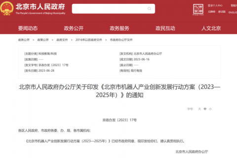 今年 6 月,北京市人民政府印发《北京市机器人产业创新发展行动方案(2023—2025 年)》,以求加快推动北京市机器人产业创新发展,打造全球机器人产业高地。方案计划组建北京市人形机器人产业创新中心,采取「公司+联盟」模式,由龙头企业牵头,通过整合创新资源,建设人形机器人研制基础条件,解决产业共性急需,加速人形机器人产品研制和推广。