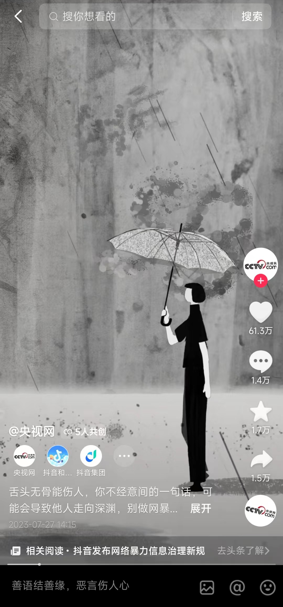 本次活动中,「央视网」与抖音共创反网暴动画,警示网络上不经意的一句话,可能会导致他人走向深渊,倡导网友「别做网暴者帮凶」。「人民网评」发布视频表示,不能任由「网络水军」成为「牛皮癣」,对网暴背后的那些兴风作浪的「网络水军」团伙,必须严惩不贷。