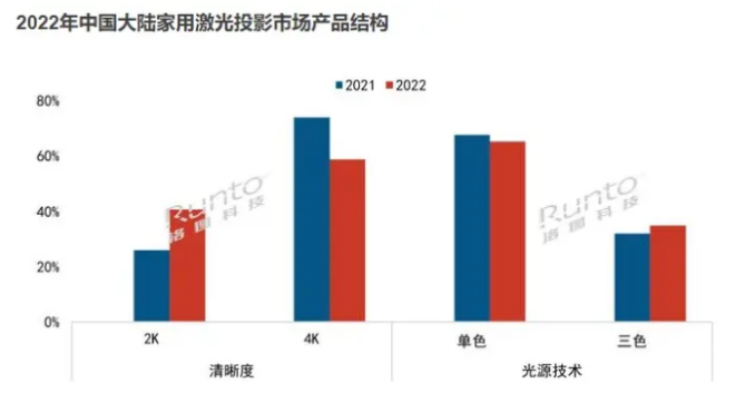 根据洛图科技(RUNTO)的数据显示,2017-2022 年,中国家用激光投影市场的复合增长率达到 44%。随着坚果投影和海信 Vidda 旗舰新品的销售,使三色激光投影的份额显著提升至 35%,洛图科技预计 2023 年三色激光投影的市占率有望再次提升 15 个百分点。