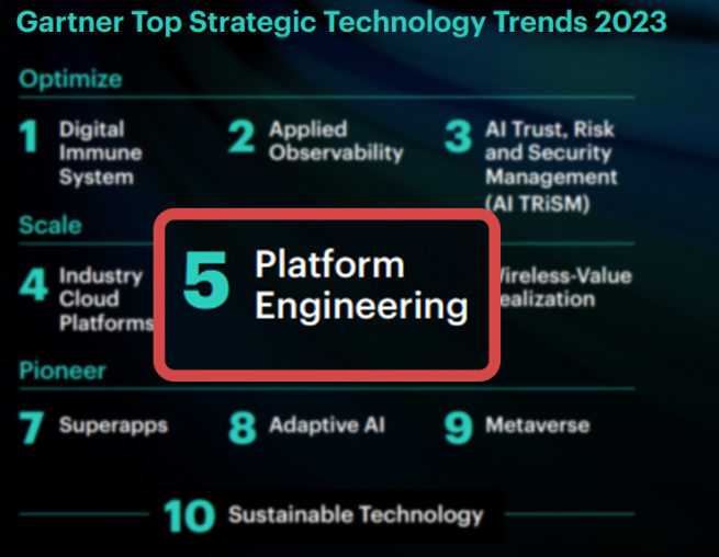 为了进一步解决当前软件工程中存在的痛点,平台工程(Platform Engineering)应运而生。今年年初,Gartner 发布的《2023 年十大技术趋势》中,平台工程被列为高速发展的技术趋势之一。在业务价值亟待保障、研发效能亟需提升的当下,国内多家知名企业已经开始平台工程实践的探索。