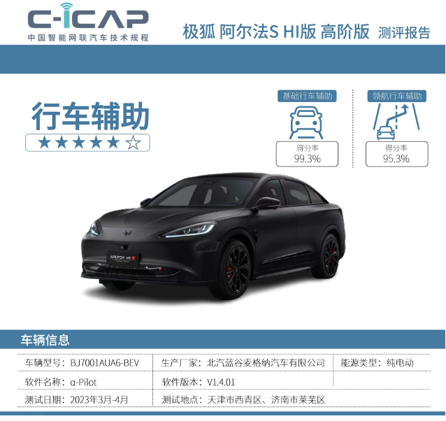 在中汽中心汽车测评管理中心发布的 C-ICAP 辅助驾驶专项测评研究报告中,极狐阿尔法 S 先行版凭借 5+星级的行车辅助评价脱颖而出,最终斩获总成绩第一,这也是首批测试车型中最高且唯一的 5+星级评价。其中,在基础行车辅助、领航行车辅助两项细分测试中,阿尔法 S 先行版分别以 99.3% 和 95.3% 的得分率全部获得同批测试车型里的最高分,智驾实力远胜同级。