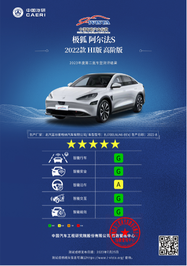 在中国汽研公布的 IVISTA 中国智能汽车指数 2023 年第二批次车型测评结果中,极狐阿尔法 S 先行版在测试的智能行车、智能安全、智能交互、智能能效项目中得到了四个「G」(优秀)评价,在智能泊车获得 A 级评价,是本期参评的 5 款测试车型中唯一的五星智能汽车。同时,在导航智能驾驶(NP)测试中,极狐阿尔法 S 先行版也成为 G+级(极优)车型,并首次将该项评测成绩拉升至 90 分以上的区间,以 94.22 分超越此前排名第一车型的 82 分,创造了中国智能汽车指数历史新纪录。