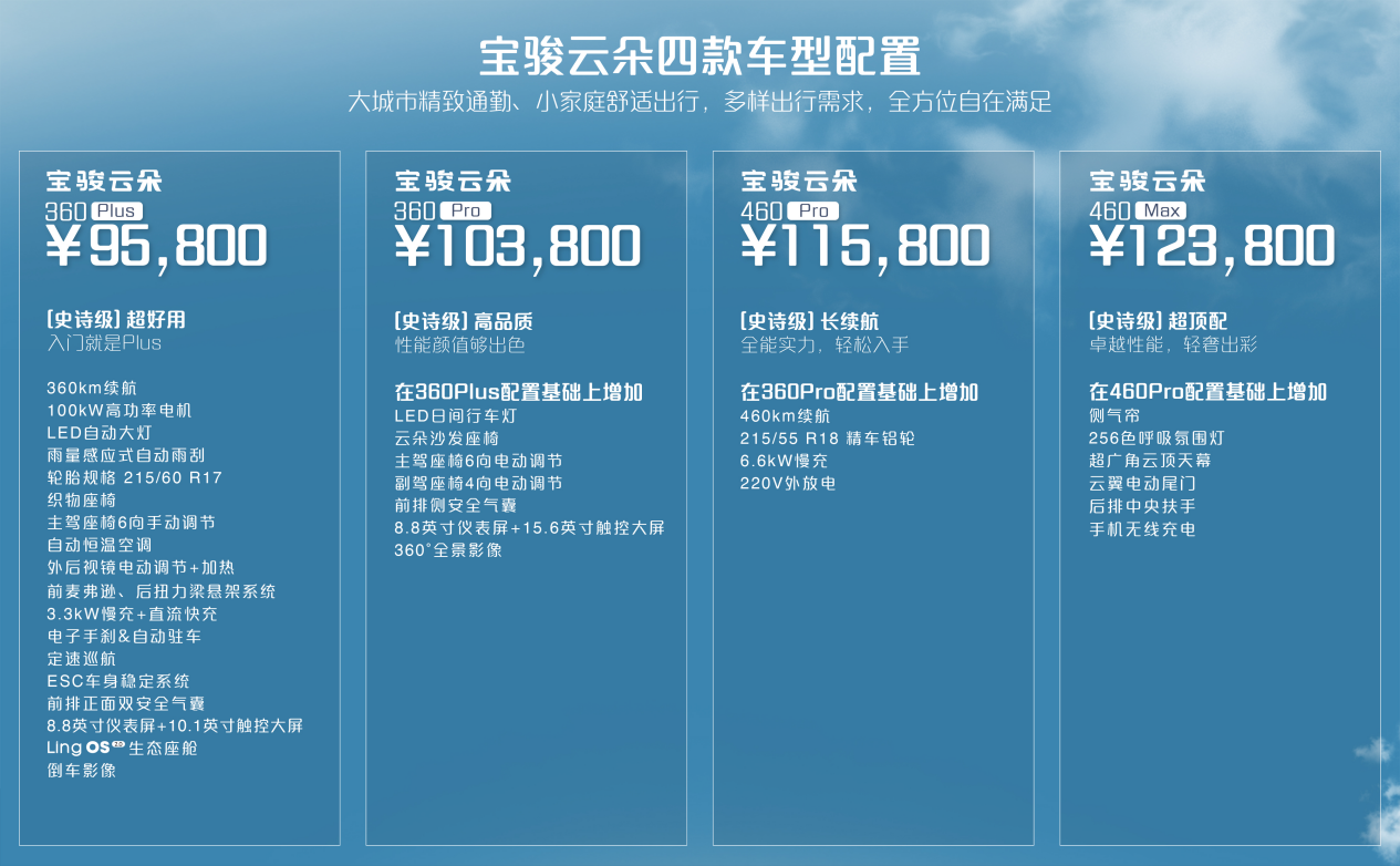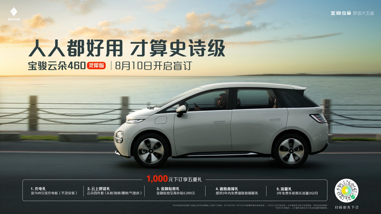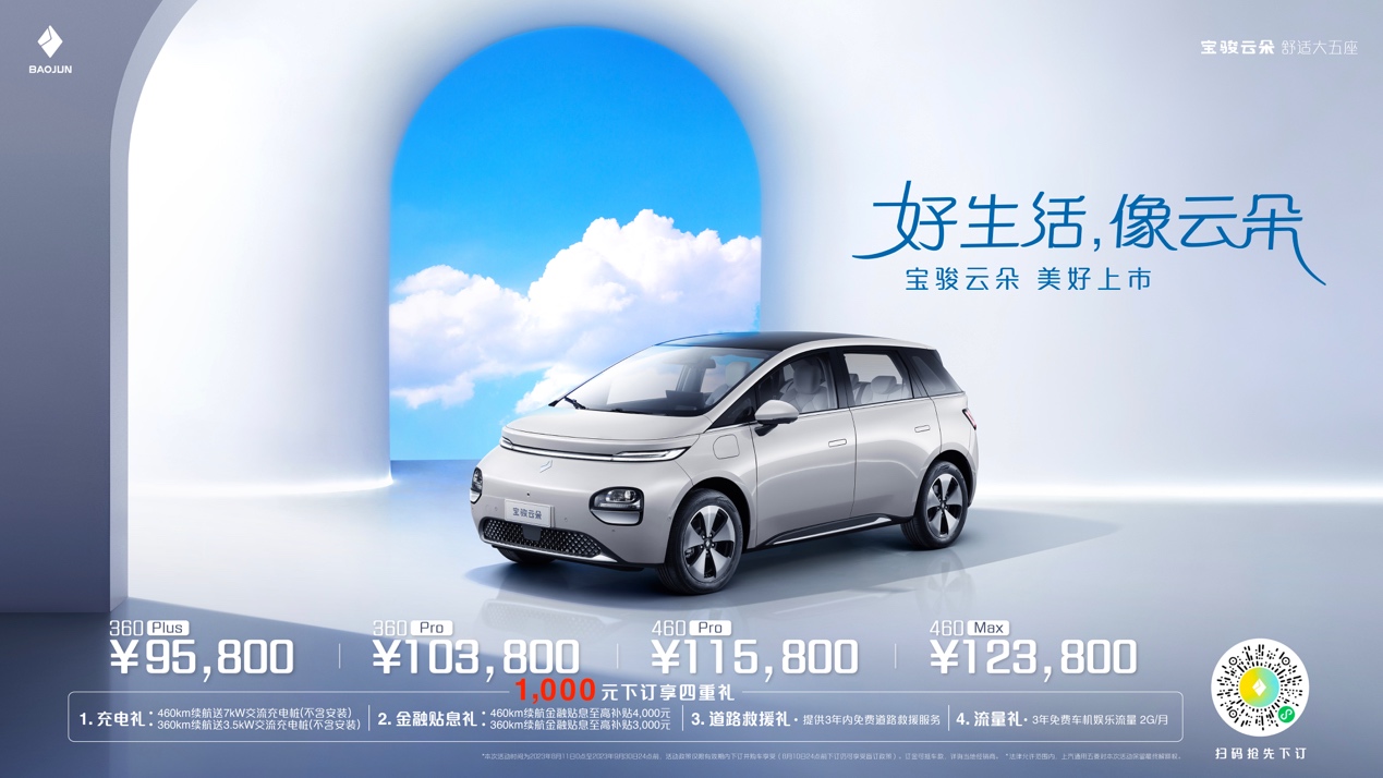 2023 年 8 月 10 日,「舒适大五座纯电家用车」宝骏云朵全国正式上市。此次宝骏云朵共上市四款配置,360 Plus 售价为 9.58 万、360 Pro 售价为 10.38 万、460 Pro 售价为 11.58 万、460 Max 售价为 12.38 万,正式将中国纯电 A 级车的价格拉到 10 万元以内,重新定义了纯电舒适家用车的新选择。除了价格惊喜之外,所有用户还可在 8 月 11 日 00:00 至 9 月 30 日 24:00 期间,参与 1000 元下订尊享超值四重限时礼遇活动,其中包含充电礼、金融贴息礼、道路救援礼、流量礼。