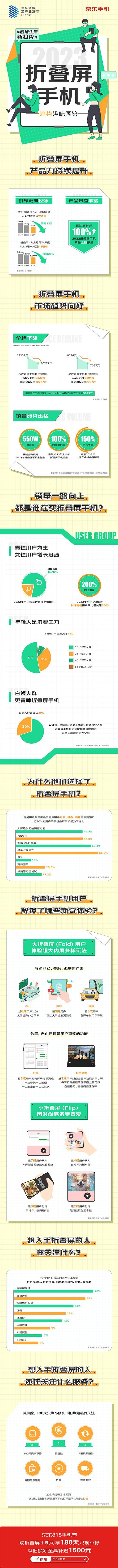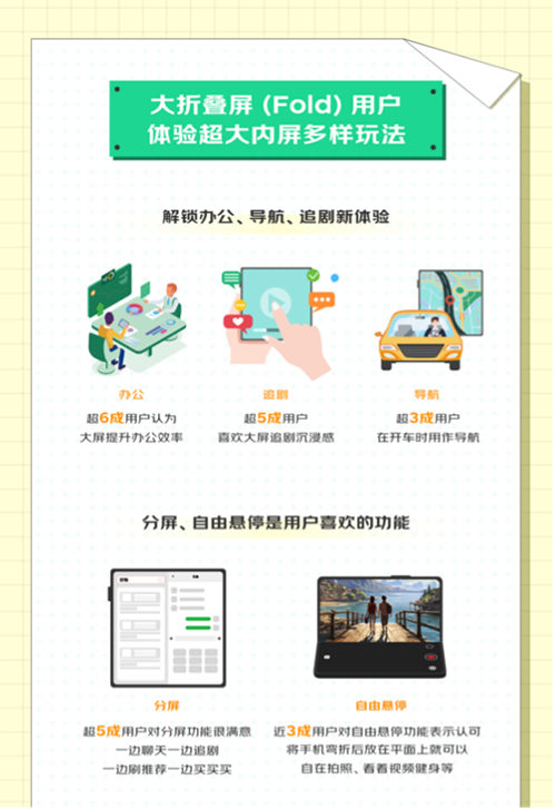 近年来,折叠屏手机凭借强悍的功能与新潮的设计为用户解锁了生活新体验。不论是为了满足办公需求、享受大屏追剧的体验,还是为了方便手持摄影,折叠屏手机都为用户带来了不同场景下的多样新体验。自 2019 年首款折叠屏手机问世以来,随着各大品牌不断加入竞争,折叠屏手机的种类不断增多,技术也日益成熟,折叠屏手机的价位已也逐渐下探到了大众可接受的范围,使得越来越多的年轻人愿意「尝鲜」折叠屏手机。根据京东数据显示,2023 年上半年京东折叠屏销量同比增长超 100%,其中年轻人的购买热情尤为明显。对用户而言,购买折叠屏手机为他们解锁了包括办公、追剧、导航、拍照等各种场景在内的新体验。根据京东消费与产业发展研究院发布的《2023 折叠屏手机趋势趣味图鉴》(以下简称《图鉴》),超过六成的用户选择大折叠屏手机是因为其强大的办公功能,如一边参加视频会议一边整理会议纪要,以及在大屏幕上查看和处理文件,以提升工作效率;超过五成的用户则因大屏追剧能带来更好的沉浸感而选择了大折叠屏手机;此外,分屏功能使得用户可以一边聊天一边追剧、一边刷推荐一边购物,自由悬停功能可以在半折状态下听音乐、健身、开会、追剧,带来更多新体验。