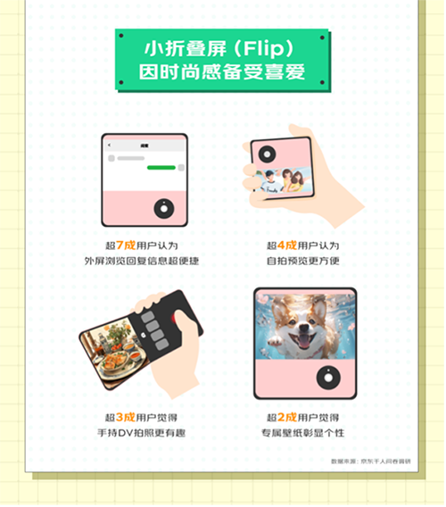 如果说大折叠屏手机更得商务、职场人士喜爱,那么小折叠屏手机就成了女性用户的时尚单品。除了其小巧便捷的特性外,小外屏的多功能支持也是吸引女性用户的重要原因。根据《图鉴》显示,超过 70% 的女性用户喜欢使用小外屏浏览信息并回复,超过 40% 的女性用户则喜欢自拍预览功能。此外,还有超过 30% 的女性用户将小折叠屏手机当作手持 DV 进行拍摄。